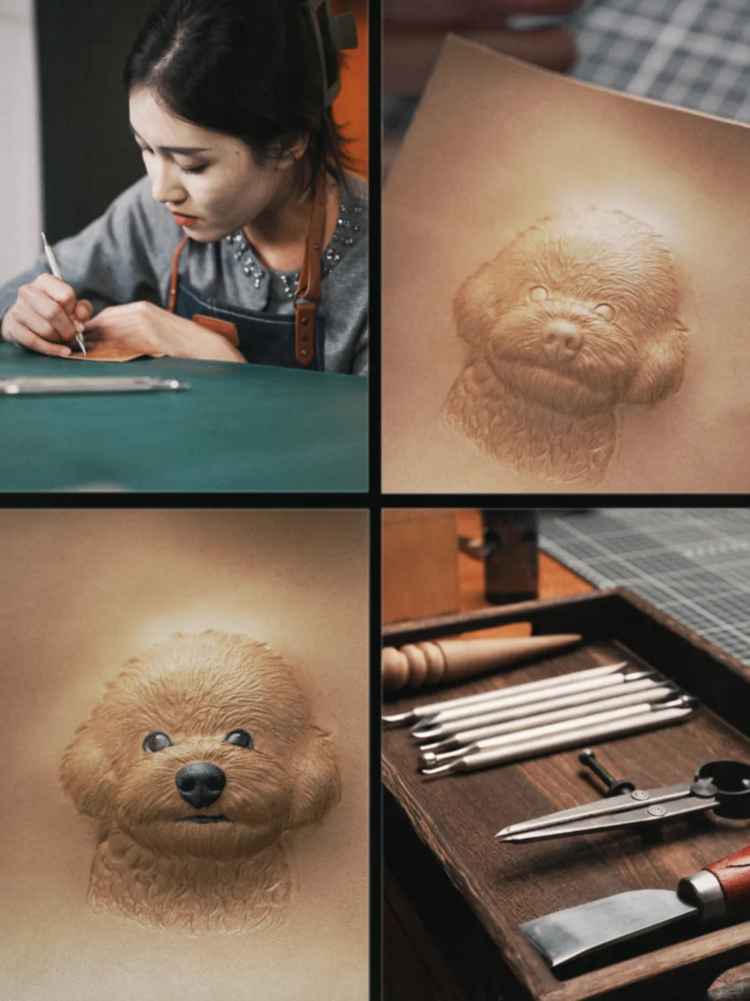 Each portrait is hand-carved, stitched, or felted using time-honored techniques. From delicate needlework to precise leather carving, every process is done step by step — because details make all the difference.